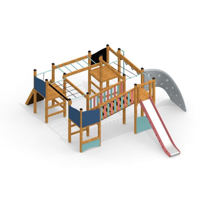 Ce point central du terrain de jeu offre une multitude d'activités conçues pour défier et divertir. Avec une variété d'options d'escalade, y compris des échelles horizontales, des murs d'escalade torsadés de manière fantaisiste, et une zone de grimpe avec des cordes, il fournit un cadre parfait pour que les enfants renforcent leurs muscles, améliorent leur coordination physique et surmontent des défis. Le pont en bois et le toboggan ajoutent au plaisir, permettant des jeux imaginatifs et des descentes palpitantes.