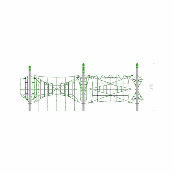 Ce parcours d’escalade est fabriqué à partir de matériaux robustes et durables : acier inoxydable, acier galvanisé et acier thermolaqué assurent une structure solide et résistante aux intempéries. Les cordes en polypropylène renforcé et souple garantissent une prise confortable et une sécurité optimale. L’utilisation d’aluminium, de polypropylène (PP), de polyéthylène (PE) et de caoutchouc complète cette construction, offrant une longévité et une fiabilité accrues.