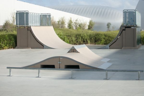Intégré harmonieusement dans la configuration du skatepark, le Fun Ramp sert de point central, encourageant l'expression créative et le développement des compétences. Sa présence renforce la fonctionnalité globale du skatepark, en faisant une destination prisée des jeunes du coin et des passionnés de skate.