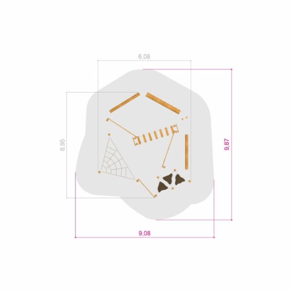 Avec une largeur de 610 cm et une longueur de 700 cm, Gobi nécessite un espace minimum de 910x1000 cm, en faisant un équipement substantiel et adaptable pour les grandes aires de jeux. Le set est construit en bois de Robinier et de Mélèze, connus pour leur endurance et résistance aux intempéries. Chaque composant est soigneusement intégré avec des matériaux supplémentaires comme l'acier inoxydable, l'acier peint par poudrage, des cordes en polypropylène renforcées, du contreplaqué antidérapant étanche, et des chaînes en acier inoxydable, améliorant la sécurité et la longévité.