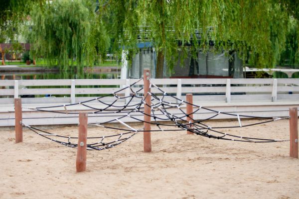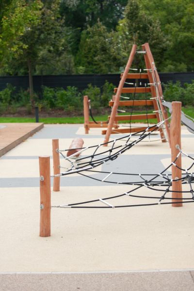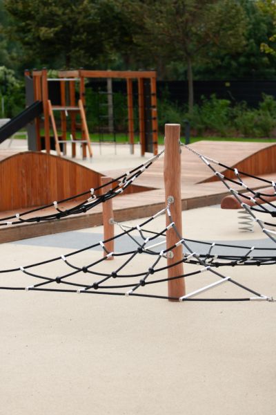 Conçu avec expertise à partir d'un mélange de cordes en polypropylène renforcées et de bois de Robinier robuste, complété par des éléments en acier inoxydable galvanisé, le Gossamer Net atteint une hauteur modeste de 150 cm. Malgré cette élévation apparemment basse, la sécurité est primordiale, nécessitant ainsi une surface sécurisée en dessous.