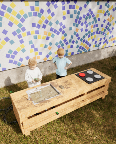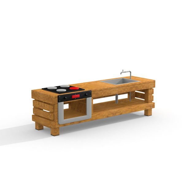 Mesurant 60 cm de largeur, 200 cm de longueur et 76 cm de hauteur, le Kitchen Table est un espace de jeu parfaitement proportionné, conçu avec beaucoup d'espace pour que les petits chefs puissent expérimenter et créer. Le design accueillant, rappelant une cuisine familiale, invite les enfants à jouer de manière coopérative, améliorant leurs compétences sociales et de communication.