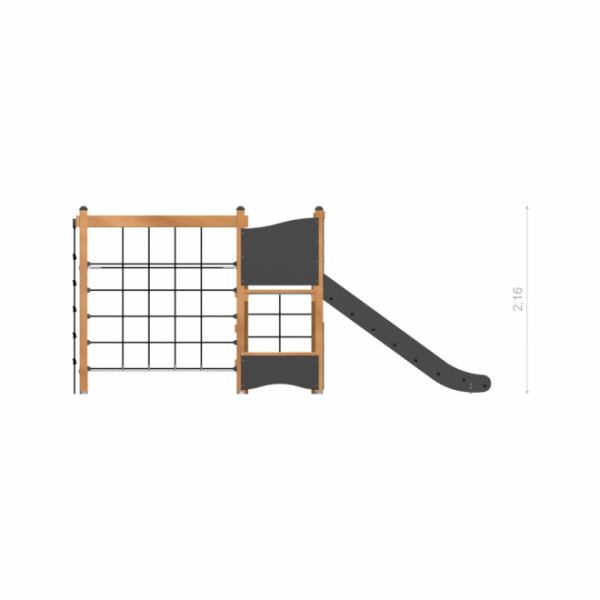 Ce petit terrain de jeu jungle offre une variété d'activités qui favorisent le développement physique et la coordination. Il présente des éléments traditionnels d'escalade comme des échelles en bois et suspendues, un filet d'escalade et une barre horizontale, tous conçus pour améliorer les compétences motrices et l'équilibre des enfants. Le toboggan en acier inoxydable offre une descente rapide et amusante, ajoutant à la joie de grimper.