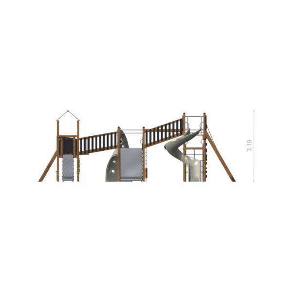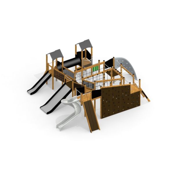Construit à partir de bois de mélèze de haute qualité, complété par de l'acier inoxydable et galvanisé, le Château Mastodon est un parangon de durabilité et d'élégance. L'intégration de cordes renforcées (PP-Polypropylène) et d'éléments en fibre de verre dans le design ajoute une couche supplémentaire de résistance et de sécurité, tandis que les caractéristiques antidérapantes et le contreplaqué imperméable garantissent un environnement sûr même par temps humide.