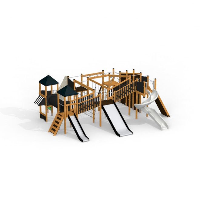 Construit à partir de bois de mélèze de haute qualité, complété par de l'acier inoxydable et galvanisé, le Château Mastodon est un parangon de durabilité et d'élégance. L'intégration de cordes renforcées (PP-Polypropylène) et d'éléments en fibre de verre dans le design ajoute une couche supplémentaire de résistance et de sécurité, tandis que les caractéristiques antidérapantes et le contreplaqué imperméable garantissent un environnement sûr même par temps humide.