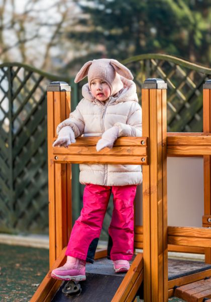 Les enfants peuvent grimper librement sur l'échelle en bois recouverte de contreplaqué antidérapant imperméable avec des pierres d'escalade en caoutchouc, traverser le pont suspendu en bois, puis descendre joyeusement sur le toboggan. L’appareil est suffisamment bas (la hauteur de la plateforme est de 55 cm) pour permettre même aux plus jeunes enfants d'y monter facilement. Il est extrêmement durable, et résistant aux conditions climatiques telles que la pluie, la neige, le soleil, le gel, la grêle ou le vent, ainsi qu'à une utilisation intensive et aux dommages.