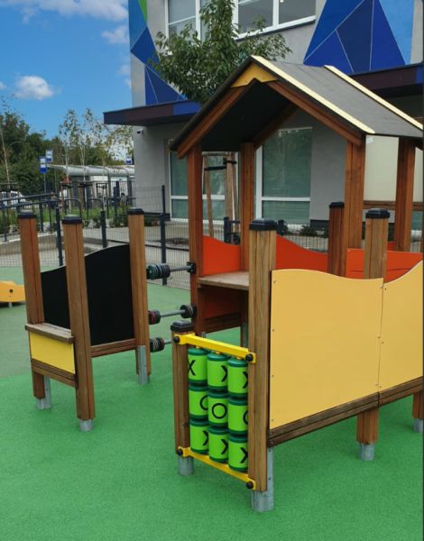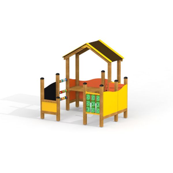 Au-delà de sa construction solide, Omega prend vie grâce à des éléments de jeu éducatifs. Abrités sous un auvent en bois, les enfants peuvent s'engager avec des jeux tactiles comme un abaque, promouvant ainsi les compétences mathématiques précoces. De plus, le jeu intemporel du morpion trouve sa place ici, encourageant la réflexion stratégique et favorisant une compétition ludique.