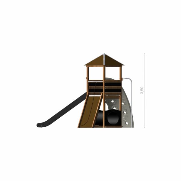 Sous la structure se trouve un tunnel caché, offrant une cachette secrète ou une aventure palpitante de passage, stimulante pour le jeu imaginatif. Une fois au sommet de la plateforme, les enfants ont deux options exaltantes pour descendre. La première est un grand toboggan en métal, parfait pour un retour rapide et palpitant au sol. La seconde est une barre de pompier, offrant une descente plus audacieuse et, pour les plus courageux, un défi d'escalade alternatif.