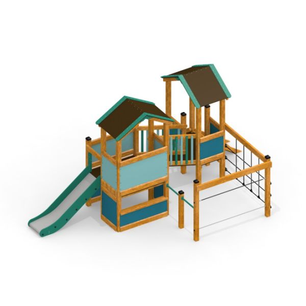 La Tower Nature n'est pas une simple maisonnette; c'est un paysage d'activités multiples. Elle offre deux tours ombragées, une trappe en bois, une échelle, un filet d'escalade, un mur d'escalade et un toboggan. Un pont, servant de corridor de rires et d'histoires, relie harmonieusement les deux tours. Les hauteurs des plateformes ont été minutieusement conçues à 55 cm et 90 cm, s'adaptant à différents groupes d'âge et assurant que les enfants ont toujours un point de vue pour observer.