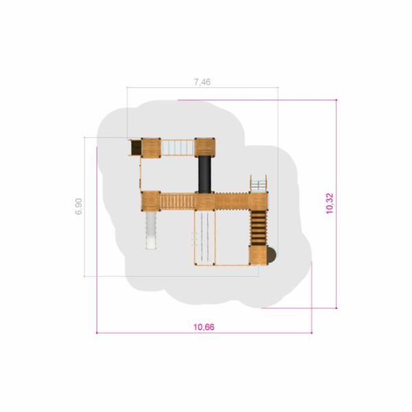 Avec une largeur généreuse de 704 cm et une longueur de 746 cm, le château Tritowers Nature impose une présence significative. Sa hauteur atteint un robuste 276 cm, attirant les regards vers le haut en admiration de sa structure imposante. La sécurité est de première importance avec une hauteur de chute critique de 265 cm, et une large zone de sécurité qui s'étend sur 1066 cm par 1112 cm. L'installation nécessite une surface de chute dédiée pour une protection supplémentaire des enfants, garantissant une expérience de jeu sécurisée.