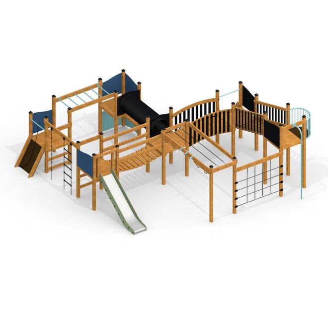 Inspiré des fortifications historiques, ce château avec toboggan combine des éléments d'escalade et d'équilibre pour défier et engager ses jeunes aventuriers. Offrant des hauteurs de plateforme variées de 90 cm, 120 cm, et 180 cm, il propose une gamme de zones d'activité conçues pour s'adapter à différents niveaux de compétence. Les enfants peuvent tester leur agilité sur l'échelle suspendue, grimper sur le mur incliné, naviguer à travers le filet de corde ou traverser l'échelle horizontale. Le pont mouvant ajoute une touche de frisson, tandis que le tunnel favorise le jeu imaginatif. Divers toboggans offrent une descente rapide et excitante, offrant une finale exaltante à l'aventure du château.