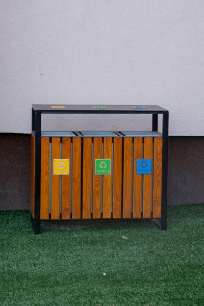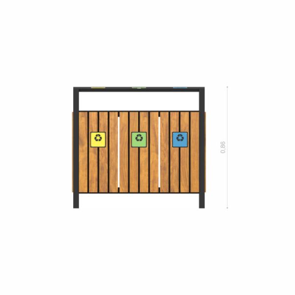 Wooden recycling bin est une poubelle de tri conçue pour faciliter la gestion des déchets tout en apportant une touche esthétique à l’espace extérieur.